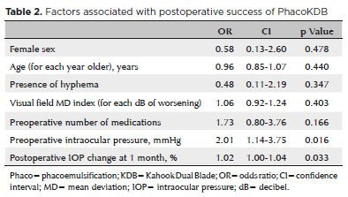 Published studies that investigated the efficacy and safety of KDB ranged from retrospective case series to prospective and comparative clinical trials(6,10). However, only few studies have evaluated the most suitable patient profile for undergoing this surgical technique, especially when combined with cataract surgery. Knowledge of the possible success predictors in patients undergoing phacoemulsification combined with cataract extraction would likely facilitate the establishment of more-consistent protocols for indication of the procedure and follow-up. Therefore, in the present study, we aimed to investigate the postoperative outcomes and evaluate the success predictors of phacoemulsification with KDB goniotomy (PhacoKDB) for cataract management in eyes with primary OAG (POAG).