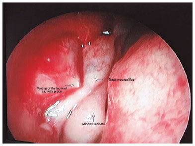 All surgeries were performed under general anesthesia, and intranasal adrenaline-soaked cotton was applied before surgery to provide decongestion and vasoconstriction. Then, a mixture of lidocaine and epinephrine was applied submucosally below the maxillary line up to the front of the middle turbinate axilla. The 0° rigid endoscope (Storz, St Louis, MI, USA) was used for imaging purposes. The mucosal incision, which started with the MVR knife from the upper part of the inferior turbinate in order to prevent the possible bleeding from preventing the image, was continued curve lineer to superior after extending approximately 10 mm towards the anterior. It was extended to 5-6-mm above the sticking point of the middle turbinate and terminated at the posterior end. The mucosal flap, which was created using freer periosteum elevator, was tilted toward the posterior. Thus, only one posterior-based nasal mucosa flap was created. With the help of Kerrison punch, the bone tissues were removed and a diamond burr was used whenever necessary. After the lacrimal sac mucosa was exposed, the lacrimal sac mucosa was tented by using a probe of the silicone tube (Silicone tube, FCI Ophthalmics, Marshfield Hills, U.S), and lacrimal sac flaps were created with the help of an MVR knife (Figure 1). After intubation with silicone tubes, the nasal mucosa flap was extended into the lacrimal sac. To stabilize these flaps and minimize synechiae, a gelatin sponge (Spongostan Standart, Ethicon, Istanbul, Turkey) soaked with steroids was placed over the nasal mucosa and lacrimal sac flaps. Endoscopic septoplasty was performed in cases that prevented visualization of the nasal cavity and narrowed the surgical area by an otolaryngologist. All patients used topical drops containing 0.3% tobramycin and 0.1% dexamethasone (Tobradex, Alcon) 4-times a day for 2 weeks. Saline nasal spray was used for a week to flush out the debris from the surgical site. As an oral antibiotic, 1-g amoxicillin/clavulanate potassium tablets (Augmentin, GlaxoSmithKline, Istanbul, Turkey) were used twice a day for 1 week. The patients were followed up on the 1st, 3rd, and 7th days of the postoperative week, once a week for the first month, and then once a month for 6 months. Endoscopic nasal cavity examination was performed on all patients at each visit. Any granulation tissues or fibrous tissues on the ostium was removed. Silicone tubes placed during the surgery were removed after 3 months. Surgical success was defined based on endoscopic examination of methylene blue dropped on the conjunctiva fornix surface to reach the rhinostomy area. Surgical failure was defined as no improvement in the epiphora and/or absence of passing methylene blue dropped into the conjunctival fornix on endoscopic examination.