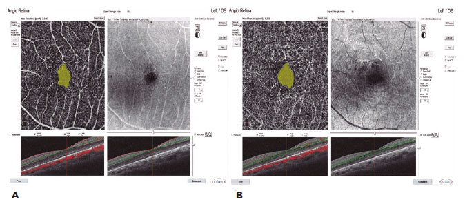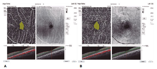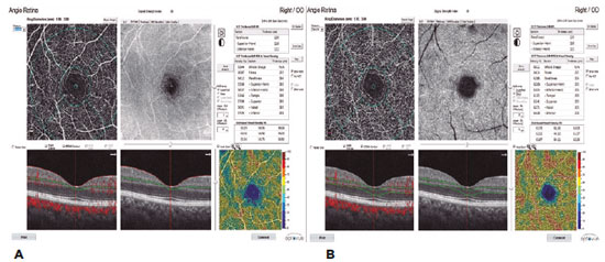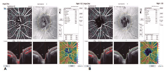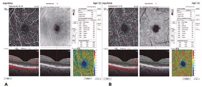 In our study, the AngioVue OCTA device (Optovue, Fremont, CA) was used to obtain split-spectrum amplitude-decorrelation angiograms (version 2016.2.0.35). An A-scan image was obtained with a light source centered at 840 nm with a scanning speed of 70,000/s and a bandwidth of 50 nm. Three-dimensional en face OCTA images were obtained by examining the macula using the 3 x 3 mm scanning protocol in the Angio Retina mode and the optic nerve using the 3 x 3 mm scanning protocol in the Angio Disk mode. All the patients’ right eyes were examined.