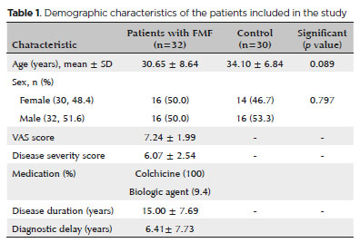 Between January 2020 and March 2020, 32 patients with FMF and 30 healthy controls were included in the study. Approval was obtained from the ethics committee of Dicle University School of Medicine. Our study was conducted in accordance with the Declaration of Helsinki, and written informed consent was obtained from all the patients before the measurement.