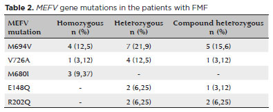 Assessment of disease severity was evaluated using the scoring system of Pras et al.(19). The scoring system has six elements, including age of onset, colchicine dose, number of attacks per month, presence of arthritis, erysipelas-like erythema, and amyloidosis. According to their scores, the patients were classified into three groups as follows: mild (2-5 points), moderate (6-10 points), and severe (>10 points).
