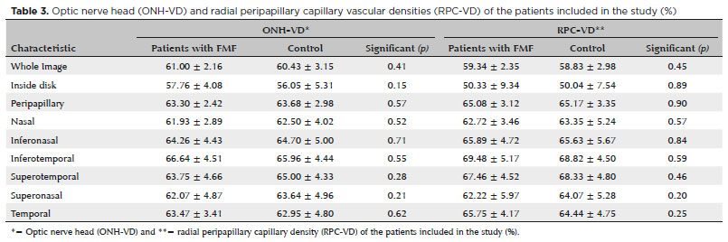 Métodos: Trinta e dois pacientes com febre mediterrânica familiar e 30 controles saudáveis foram incluídos neste estudo. Todos os pacientes foram submetidos a um exame oftalmológico completo, incluindo a acuidade visual melhor corrigida e medida da pressão intraocular. O aparelho AngioVue Optical coherence tomography angiography (Optovue, Fremont, CA) com angiografia de correlação de amplitude de espectro dividido foi utilizado para avaliar e examinar a estrutura microvascular da retina. As angiotomografias de coerência ópticas en face tridimensionais foram obtidas examinando o protocolo de varredura macular 3 x 3 mm (modo angio retina) e o nervo óptico com o protocolo de varredura 3 x 3 mm (modo angio-disco). Todos os olhos direitos dos pacientes foram examinados.