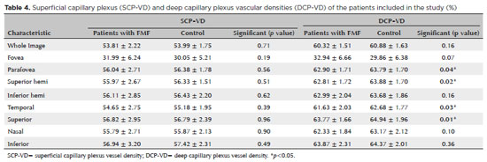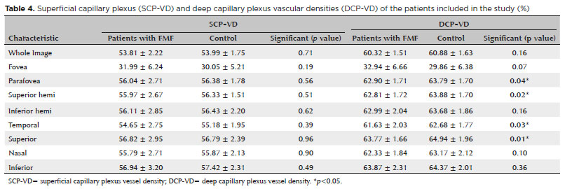 In conclusion, we found that DCP-VD was significantly lower in the parafovea, superior hemi, temporal, and superior regions in the patients with FMF than in the controls. Moreover, the deep FAZ area was found to be larger in the patients with FMF. Therefore, especially in patients with FMF, the use of OCTA, a noninvasive and easily applicable method, can be useful for both understanding the systemic effects of the disease and the possible pathophysiological mechanisms of the disease by evaluating the potential risk of possible microvascular complications. However, studies with multicenter and large patient series may contribute to the literature on this subject in the future.