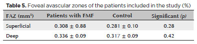 In our study, in accordance with the literature, we found deep FAZ changes in the patients with FMF. Increased FAZ, which may be an indication of decreased foveal microcirculation and macular ischemia, has been previously reported in other diseases(30,31).
