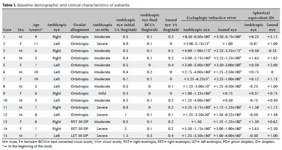 We included 15 patients with unilateral amblyopia with a median age of 7.3 ± 1.9 years, of whom 9 were men. In the anisometropia group (n=9), 3 patients had hyperopia, 8 patients had astigmatism, and 1 patient had hyperopia and astigmatism. In the strabismic amblyopia group (n=3), all patients had horizontal and unilateral strabismus. Regarding amblyopia severity, 1 patient had mild amblyopia and was anisometropic, 9 patients had moderate amblyopia, and 5 patients had severe amblyopia. The mean basal visual acuity values were 0.7 ± 0.3 logMAR (Logarithm of the Minimum Angle of Resolution) in amblyopic eyes and 0.15 ± 0.12 logMAR in fellow eyes (p<0.05).