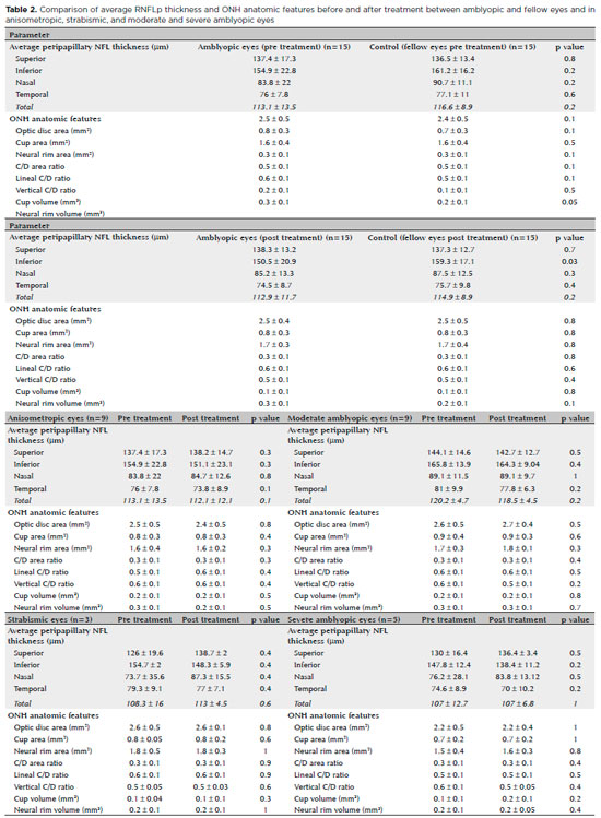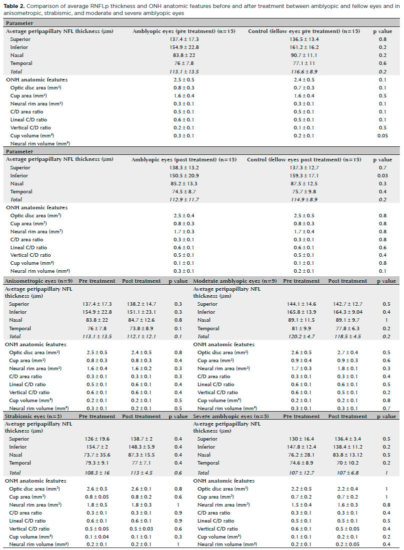 Table 2 summarizes the comparative results of RNFLp thickness and ONH anatomic features between amblyopic and fellow eyes both before and after treatment and in amblyopic eyes. A significant difference was found only in the inferior quadrant of RNFLp thickness, which was lesser in amblyopic eyes than in fellow eyes after treatment (150.5 ± 20.9 and 159.3 ± 17.1 µm, p=0.03).