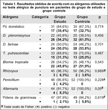 Os resultados do teste alérgico de punctura (Prick Test) estão dispostos na tabela 1.