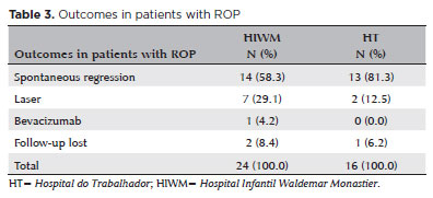 Two patients (12.5%) at the HT and 8 (33.3%) at the HIWM had severe ROP and required treatment (laser and antiangiogenic) (Table 3); it was not possible to perform the statistical analysis owing to the small samples sizes.