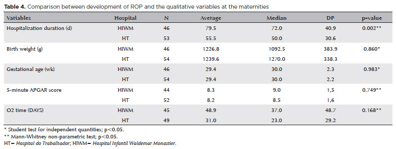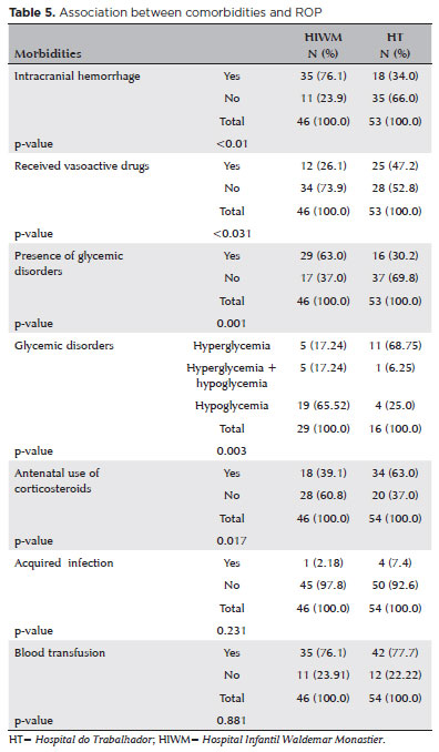 There was no significant difference in the birth weight, GA, and oxygen-therapy duration between the groups (p=0.860, p=0.983, and p=0.168, respectively) (Table 4). Not even when relating ROP to sex, APGAR of the fifth minute, presence of acquired infection and need for blood transfusion (p=0.234, p=0.749, p=0.231, and p=0.881, respectively) (Tables 4 and 5).
