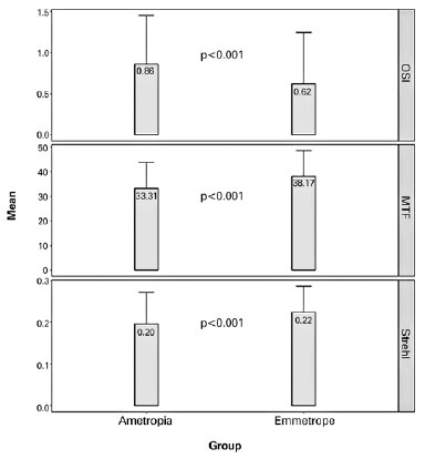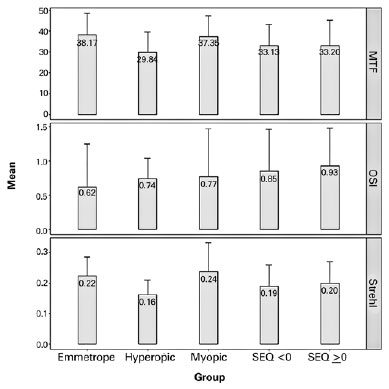 Results: The mean objective light scatter indices were 0.62 ± 0.63, 0.77 ± 0.70, 0.74 ± 0.30, 0.93 ± 0.55, and 0.85 ± 0.61, and mean Strehl Ratio and Modulation Transfer Function scores were 38.17 ± 10.4, 37.37 ± 10.06, 29.84 ± 9.71, 33.2 ± 12.11, and 33.13 ± 10.09 in emmetropes, myopia, hyperopia, spherical equivalent of ≥0, and spherical equivalent of <0, respectively. Differences in all variables were significant between emmetropic and corrected hyperopic and between spherical equivalent of ≥0, and spherical equivalent of <0 eyes (p<0.05).