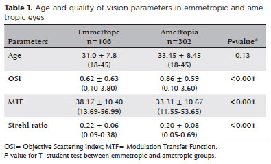 Métodos: Estudo prospectivo, transversal, incluindo 408 olhos. O grupo ametrópico era de olhos com melhor acuidade visual corrigida de 0,0 logMAR ou melhor e apresentando, pelo menos, um erro refrativo de 0,25 D ou mais. Os pacientes foram submetidos a exame com lâmpada de fenda, acuidade visual, refração e qualidade óptica com o HD Analyzer.