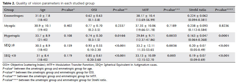 Conclusão: Em condições com lentes corrigidas (com armações de prova), os olhos emetrópicos e com miopia simples apresentaram qualidade óptica significativamente melhor em comparação com os olhos hipermétropes e astigmáticos. O significado clínico destes resultados deve ser estudado posteriormente.