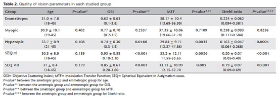 Although our study’s quantitative values show a significantly better vision quality in the emmetropic and myopic groups over the hyperopic and astigmatic groups, these results should be cautiously interpreted in the clinical setting. With regard to the measured parameters, OSI of <1 is regarded as normal; therefore, all groups (emetropes, myopia, hyperopia, and astigmatism) in our study actually showed normal OSI values(19), and the obtained MTF cutoff values seem to be on the lower end when compared to the relevant literature(20); however, the mean Strehl ratio was consistent with that in the literature(15).