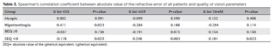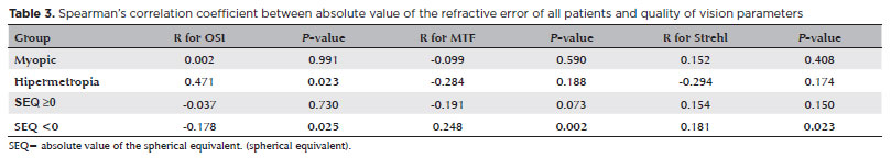 Table 3 shows the Spearman’s rank correlation coefficient [R] value among different ametropic groups (myopia, hyperopia, SEQ ≥0, and SEQ <0) and the vision quality parameters (OSI, MTF, and Strehl). Despite significant correlations were found between magnitude of the ametropia in some groups and some of the vision quality parameters, these correlations were <0.5, representing a weak correlation.