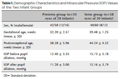 Methods: This prospective study involved 55 eyes of 28 preterm infants and 38 eyes of 20 term infants. The infants were divided into two groups according to their gestational ages at birth as follows: preterm group, <37 weeks and term group, ≥37 weeks. Pupil dilation was attained with tropicamide 0.5% and phenylephrine 2.5%. Intraocular pressure measurements were performed with Icare PRO (Icare Finland Oy, Helsinki, Finland) before and after pupil dilation. A paired t test was used to compare the measurements before and after pupil dilation.