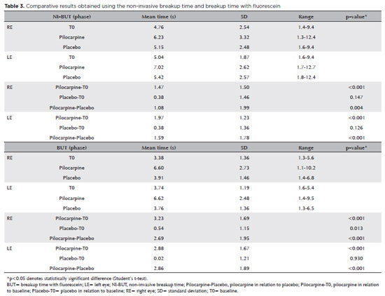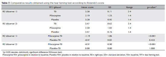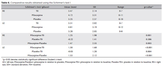 We compared the means of the variables under the effect of pilocarpine and placebo in relation to baseline. Student’s t-test was applied for paired samples, while the Wilcoxon test was utilized for quantitative and qualitative data analysis. For the tear ferning test, the Kappa coefficient was calculated to assess inter-observer reproducibility. The statistical level of significance was set at 5%.