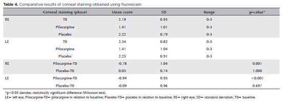 The validated questionnaire NEI-VFQ 25 was applied to assess the impact of dry eye on the quality of life of each patient. A global index was generated ranging 0-100; higher scores indicated lower negative impact of the disease in the quality of life(9). The dry eye specific questionnaire Ocular Surface Disease Index (OSDI®; Allergan, Irvine, CA, USA) was applied to assess the impact of dry eye on ocular discomfort. The survey generated a score ranging 0-100 (0 indicated absence of eye discomfort and 100 represented maximum eye discomfort)(10). The evaporative dry eye component of both eyes was studied through the non-invasive measurement of the tear breakup time using the Tearscope-plus® device (Keller, England, Inc) and fluorescein 1% staining. Next, the impact of dryness on the ocular surface was investigated with fluorescein and rose bengal vital dyes. A corneal staining score was generated from the fluorescein staining (0 = absence of keratitis; 1 = mild keratitis with distant staining points from each other; 2 = moderate keratitis with staining points closer; 3 = severe keratitis with confluent staining points). Subsequently, the tear flow was assessed by Schirmer’s test, performed without using anesthetics (Schirmer’s test I). Finally, the traditional van Bijesterveld score was calculated following the evaluation of the ocular surface with rose bengal 1% staining (scores: 0-9)(11). The entire process was performed and evaluated by a single examiner. The following day, the quality of the tear film was studied using the tear ferning test using collected tear samples, according to the technique proposed by Rolando (scores I, II, III and IV, according to the appearance of the ferning branches observed). Scores I and II are traditionally considered normal, whereas scores III and IV are considered abnormal)(12). Only samples from the right eye of each patient were collected. The ferning patterns were evaluated and classified by two independent observers. The frequency of side effects at the end of each phase was recorded. A questionnaire containing a list of the most frequent side effects reported after the use of oral pilocarpine was distributed to the patients.