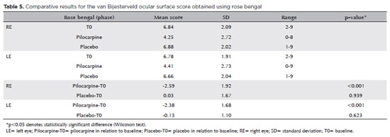 Results: According to the NEI-VFQ-25, there was statistically significant improvement in the quality of life following oral pilocarpine. Similar results were observed for ocular discomfort, as determined by the Ocular Surface Disease Index. All clinical tests showed favorable and statistically significant results following the use of oral pilocarpine. Regarding the analysis of tear samples, there was an improvement in the quality of tear film. This was evidenced by the modification of the patterns observed in the tear ferning test. Side effects were reported by 96.8% and 56.2% of the patients who received pilocarpine and placebo, respectively. Sweating was the most frequently reported side effect (67.74% versus 11.11%, respectively).