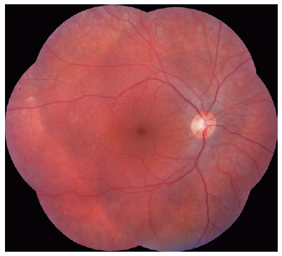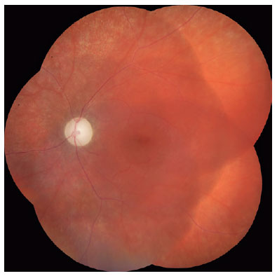 Dilated fundus examination and retinography (Visucam 524, Carl Zeiss Meditec, Inc, Dublin, CA) revealed normal optic excavation and subtle foveal and parafoveal pigmentary changes in the right eye (Figure 1). In the left eye, we observed attenuation of the retinal vessels, with no intraretinal pigmentation (bone-spicule deposits) and optic disc pallor with large excavation (Figure 2). Visual fields were obtained using the Humphrey Field Analyzer II (model 750i; Carl Zeiss Meditec, Inc) and showed diffuse loss of retinal sensitivity, with central island of vision in the left eye. The axial length measured using optical biometry (IOL Master 700, Carl Zeiss Meditec, Inc) was 21.07 mm in the right eye and 20.48 mm in the left eye, and the anterior chamber depths were 2.73 and 2.58 mm in the right and left eyes, respectively. Ultrasound biomicroscopy (Vumax, Sonomed, New Hyde Park, NY) revealed an anteriorly positioned ciliary body, supporting the peripheral iris, along with absence of any iris cyst and ciliary sulcus.