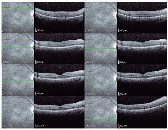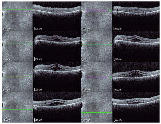 Spectral-domain optical coherence tomography (Spectralis, Heidelberg Engineering GmbH, Heidelberg, Germany) revealed a bilateral cystoid macular edema that was most prominent in the left eye (Figures 3 and 4). Genetic screening revealed heterozygous variants in the CRB1 gene (c.2843G>A and c.2506C>A), confirming the diagnosis of RP. The patient´s intraocular pressure (IOP) remained high, despite maximum medical treatment and the angle remained closed despite YAG laser iridotomy. Trabeculectomy was performed in the left eye to achieve adequate IOP control.
