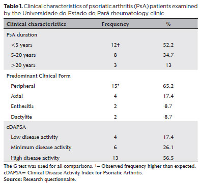Psoriatic arthritis is a heterogeneous disease with complex presentation, hampering the identification of specific risk factors. While distribution shows no sex predominance(2) as observed in the present study, one study found that the disease is more common in Caucasians(14). Here we found no statistical difference between Caucasian and X patients, but miscegenation is high among the Amazon population.