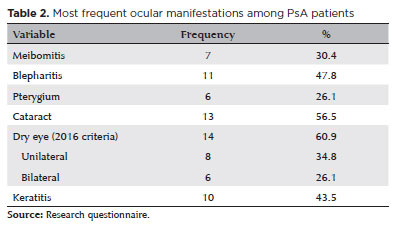 Psoriatic arthritis (PsA) is a chronic inflammatory arthropathy associated with psoriasis(1) in 4%-30% of patients(2). In Brazil, PsA is the second most frequent spondyloarthropathy, accounting for 13.7% of total cases(1). Among the most important extra-articular manifestations are ocular symptoms, which are observed in about 31% of PsA patients(3) and may be directly associated with the disease or secondary to treatment(4). The most frequently observed ophthalmic complications in previous study cohorts were conjunctivitis (19.6%), uveitis (5%), blepharitis (12.5%), cataracts (10%), glaucoma (10%), superficial punctate keratitis (22.5%), pinguecula (20%), and keratoconjunctivitis sicca (15%)(5,6).