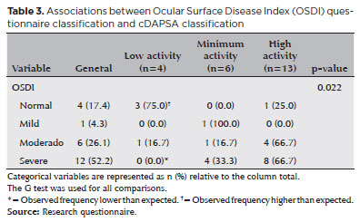 Twenty-two of 23 patients (95.7%) reported at least one of the three primary ophthalmic conditions, biomicroscopy abnormalities, dry eye, and keratitis. Ophthalmological findings are described in table 2. Twenty-one patients (91.3%) demonstrated low TBUT (<10 s), 19 (82.6%) an OSDI score ≥13, 11 (47.8%) an abnormal Schirmer I test (≤10 mm), 10 patients (43.5%) abnormal fluorescein staining, and 4 patients (17.4%) abnormal lissamine green staining. There were no statistically significant associations between OSDI scores and eye test results or cDAPSA clinical activity classification (Table 3).