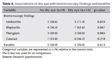 Ophthalmological symptoms vary according to ocular pathology. Dry eye may cause a ‘gritty’ or ‘sandy’ sensation, burning, itching, visual turbidity, and excessive tearing(29), manifestations found in most of the patients in this study. Dry eye is a multifactorial disease of the ocular surface characterized by a loss of lacrimal film homeostasis and accompanied by ocular symptoms caused by instability and hyperosmolarity of the lacrimal film, inflammation of the ocular surface, and sensorineural abnormalities(29). Shimazaki (2018)(12) found a significant relationship between dry eye symptoms and clinical signs. In the present study as well, symptoms as assessed by the OSDI questionnaire(30) were correlated with ophthalmological signs of dry eye.