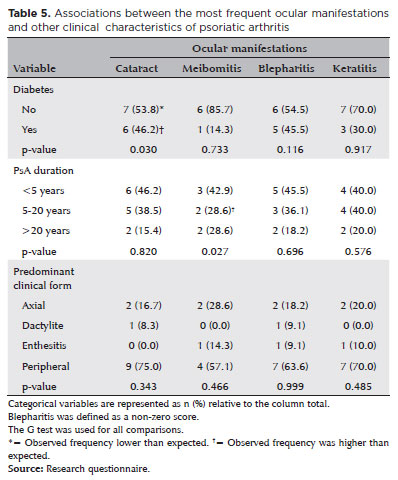 The most frequent ocular findings found in the present study were dry eye (60.9%), cataracts (56.5%), blepharitis (47.8%), keratitis (43.5%), meibomitis (30.4%), pterygium (26.1%), and pinguecula (13%), while other ocular manifestations were observed in only one or two patients. Although cataracts are often one of the most frequent ocular symptoms, lens abnormalities are generally considered an incidental effect of advanced age(18). Chandran and colleagues(19) found that 63% of PsA patients had bilateral cataracts, although there was no control group. Furthermore, diabetic patients also show a higher incidence of cataracts due to osmotic changes from acute glycemic decompensation, which induce refractive and accommodative changes in the lenses(20). Thus, the high incidence of cataracts may have been an indirect consequence of diabetes.