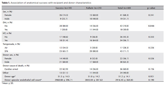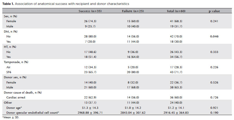 Métodos: Foram incluídos neste estudo retrospectivo enxertos obtidos de doadores não diabéticos e 60 casos operados por um único cirurgião. Foram registrados os dados dos casos, incluindo a presença de diabetes mellitus e hipertensão, medicamentos antidiabéticos e anti-hipertensivos, tamponamentos intracamerais e desfechos anatômicos. Os dados dos doadores foram obtidos dos prontuários do banco de olhos.