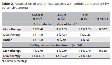 In their study, Vianna et al. investigated the association of factors such as DM and HT, hyperlipidemia or obesity, and tobacco use in donors with the success of endothelial graft preparation and found that these factors were associated with high failure rates(9). DM and hyperlipidemia or obesity were statistically significantly associated with graft preparation failure (p=0.000028 and p=0.004, respectively). The authors emphasized that these factors cause the formation of toxic products in the presence of oxidative stress, such as the advanced glycation end products formed in diabetes, and may lead to alterations in the morphology of tissues. DM and HT can occur in the same individual simultaneosly. Williams et al. developed a 5-point DM rating scale to assess the severity of DM in donors(20). In accordance with this scale, 1 point was added to the score when HT was present in the donor. Therefore, the presence of HT can be considered a factor that increases the effect of DM on the donor tissue preparation failure rate. In our study, we did not apply such rating to the recipients. However, most of the patients with diagnosed DM already had HT. In these cases, this co-incidence showed no significant effect on anatomical success (p=0.223). A study that compares diabetes- and hypertension-only recipients may reveal the effect of DM more apparently. In our study, we investigated how the presence of HT, one of the above-mentioned factors, affects surgical success. Sixteen of the 34 patients with HT did not achieve endothelial attachment in a single session, but this did not reach statistical significance. Twenty-three of these patients were taking dual antihypertensive treatments for blood pressure control. However, no significant association was observed between the treatment protocols and anatomical success.