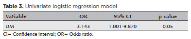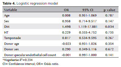 Then, a logistic regression model was applied to the data, and the results are presented in tables 3 and 4. We found that the presence of DM in the recipients was the most important risk factor in the univariate and multivariate models. On the basis of our results, the diabetic patients had a 1.4-fold higher risk of failure than the nondiabetic patients. In this model, age, sex, presence of HT, and type of tamponade used were not associated with anatomical success. No statistically significant association was found between donor age and anatomical success in our study, and the expected trend is that the risk of failure decreases in older donors(11,12).