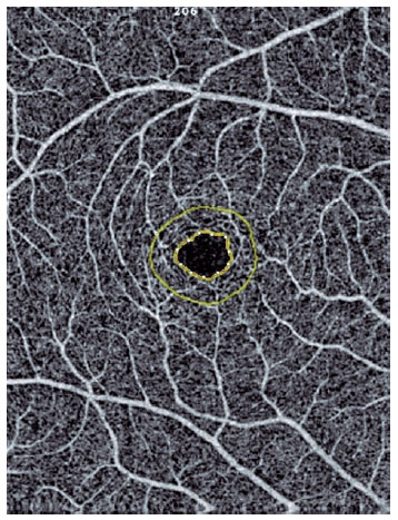 Ninety-eight eyes of patients were compared to those of healthy controls. Patients who presented to the internal disease clinic for routine health control and whose vitamin S level was ≤20 ng/mL were enrolled in the study group. Individuals whose serum vitamin D levels were ≥30 ng/mL were allocated to the control group. Patients with retinal vascular diseases (i.e., any stage of diabetic and hypertensive retinopathy, senile maculopathy, and uveitis); any kind of nystagmus; a history of previous ocular surgery, amblyopia, glaucoma, or systemic diseases (i.e., diabetes, arterial hypertension, dyslipidemia, vasculitis, and rheumatologic and neurologic diseases); optic nerve disease; spherical power >3 diopters (D); cylindrical power >1.5 D; axial length (AL) >26 mm and <20 mm; and best-corrected visual acuity (BCVA) <1.00 decimal were excluded. In both groups, one eye that was eligible for inclusion was randomly selected. Patients whose body mass index was <18 kg/m2 and >25 kg/m2 and who were taking vitamin D analogs were also excluded. Images with artifacts and signal strength index <60 were not used. All patients provided informed consent. After a complete examination, macula-centered photos were automatically taken by a single expert who was blinded to the study using RTVue-XR Avanti (Optovue, Inc., CA, USA) on a 6.0 × 6.0-mm scan size. The vessel density (VD) in the superficial (SCP) and deep capillary plexus (DCP), choriocapillaris flow area, and foveal avascular zone (FAZ) area were measured (Figures 1, 2, 3, 4). OCT-A examinations and data were analyzed by an author who was blinded to the study groups. The OCT-A parameters were automatically calculated using the software embedded in the devices. The retinal microvasculature was analyzed using the automated retinal layer segmentation algorithm available on the device. In cases with insufficient automatic layer segmentation, the correction was manually performed.