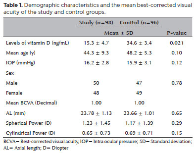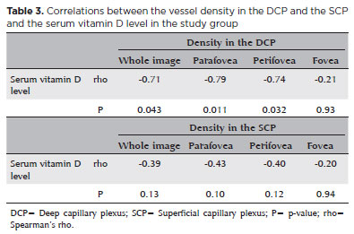 Resultados: Os grupos mostraram-se semelhantes em relação à melhor acuidade visual corrigida, ao gênero, ao comprimento axial, ao erro refrativo, à idade e à pressão intraocular ajustada. O nível médio de vitamina D foi significativamente menor no grupo de estudo (p=0,021). As densidades total, parafoveal e perifoveal do plexo capilar profundo foram significativamente maiores no grupo de estudo que no grupo controle (respectivamente, p=0,012, p=0,014 e p=0,023). As áreas da zona avascular foveal e do fluxo coriocapilar foram semelhantes nos dois grupos (respectivamente, p=0,37 e p=0,27). Além disso, houve uma forte correlação negativa do nível sérico de vitamina D com as densidades vasculares medidas em toda a imagem e nas regiões parafoveais e perifoveais do plexo capilar profundo no grupo de estudo (respectivamente, ρ de Spearman = -0,71, p=0,043; ρ de Spearman = -0,79, p=0,011; e ρ de Spearman = -0,74, p=0,032).