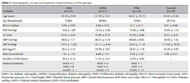 Individuals who had a refractive error >±3 diopters and an axial length <21.5 mm and >24 mm, a history of ocular surgery, an intravitreal or subtenon injection, other ocular diseases (retinal vein occlusion, glaucoma, or ocular inflammation), a history of grid/focal or panretinal photocoagulation laser treatment, a smoking habit, hypertension, kidney failure, liver failure, heart failure, body mass index (BMI) values <18.5 and >30 kg/m2; and oral antidiabetic drug and insulin use were excluded from the study. After a detailed ophthalmologic examination, including assessments of refraction, axial length, best-corrected visual acuity, slit-lamp biomicroscopy, and intraocular pressure by applanation tonometer, a dilated fundus examination was performed by the same ophthalmologist. Moreover, systolic and diastolic blood pressures, BMI, and hemoglobin A1c level were examined, and the disease duration and treatments of all the patients with diabetes were recorded.