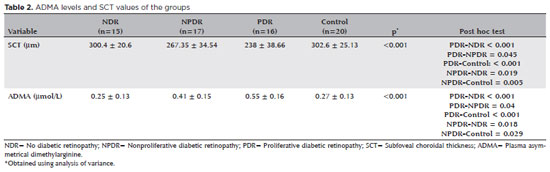 Métodos: Foram incluídos 68 casos, compreendendo 15 pacientes sem retinopatia diabética, 17 pacientes com retinopatia diabética não proliferativa, 16 pacientes com retinopatia diabética proliferativa, e 20 casos saudáveis (grupo de controle). A espessura subfoveal da coroide foi medida manualmente, usando o programa de varredura com tomografia computadorizada óptica com imagem profunda aprimorada, e os níveis plasmáticos de dimetil-arginina assimétrica foram medidos usando um kit microELISA comercial.