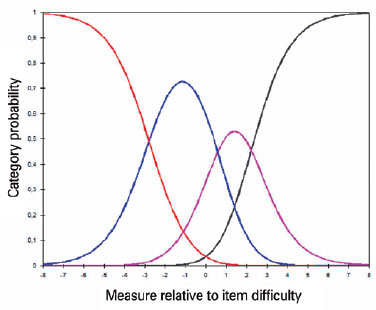 The probability curves showed no evidence of threshold disorders (Figure 1); that is, the three thresholds of each item’s response categories were correctly ordered (-2.79; 0.57; 2.22 logit).