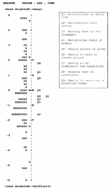 By using logarithmic transformations, the Rasch model is essentially a probabilistic theoretical model to which the collected data are compared(17). Conventionally, “logit” is attributed to the average difficulty of an item. Considering the “people” category, the logit measurement indicates how a person is more skilled than another (for example, whether a person has greater visual ability than another). Considering the “item” category, the logit calibration indicates how difficult an item is than another (for example, is reading a printed newspaper more difficult than recognizing faces of people you meet?).