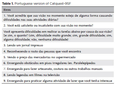 Conclusions: The Portuguese version of Catquest-9SF presents evidence of validity and reliability, in addition to being linguistically and culturally understandable for Portuguese-speaking patients born in Brazil. The questionnaire is easy to understand and quick to apply, as it could adequately estimate the subjective visual functioning in patients with cataracts. We found a significant correlation between visual acuity and the questionnaire score.