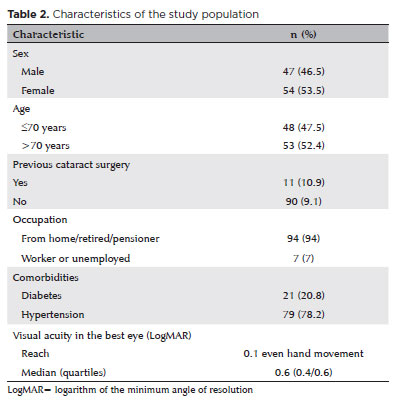 Of the 120 evaluated volunteers, 101 patients participated in the validation process. Difficulty in understanding and communicating in spoken or written Portuguese accounted for 79% of the 19 patients excluded. The mean (±standard deviation) age was 70.26 ± 9.003 years, and 53.5% of the patients were female (Table 2).