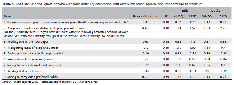 Results: The Portuguese version of Catquest-9SF demonstrated an acceptable adjustment of the items (item fit statistics ranging from 0.7 to 1.3), unidimensionality (principal component analysis), and good organization in the item response categories (thresholds of the categories: -2.79, 0.57, and 2.22, respectively). The questionnaire contains items with stable relationships if considered at the same level of visual impairment in the comparison between the two groups (absence of differential item functioning). The separation of people (person separation index, 3.07) was adequate. The visual acuity in the logarithm of the minimum angle of resolution (logMAR) in the best eye with the best optical correction showed a statistically significant correlation with the Catquest-9SF logit score (r=0.282 and p=0.004).