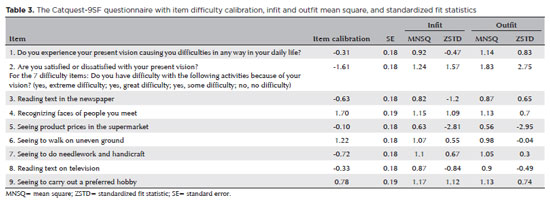 The presence of an outfit MSQN value >1.3 was observed in Table 3 (item 2, satisfaction with vision). After reviewing the data, we noticed that the value was influenced by the result of a single patient who had very high MSQN and ZSTD values (7.1 and 2.44, respectively). In this case, the patient reported having great difficulties in all aspects (maximum scores), but even so, he did not declare complete dissatisfaction with his vision, generating inconsistency in the overall response. When reviewing the characteristics of this patient in the database, we could not find a reason for this response pattern except for personal choice. The occurrence of this finding, however, does not influence the overall result of the analysis.