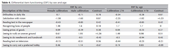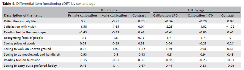 Finally, the Rasch model starts from the assumption that the behavior of an item is only a result of the level of ability (visual impairment) of the subjects who respond to it. Characteristics such as sex and age should not influence the item behavior. On the other hand, item calibration variations according to the specific characteristics of the subjects signal item differential response, also called “differential item functioning (DIF),” which impacts validity. A DIF value >1.0 logit is considered significant, indicating that the item has no stable relationship at the same level as the latent trait, when two groups are compared(8,14–16).