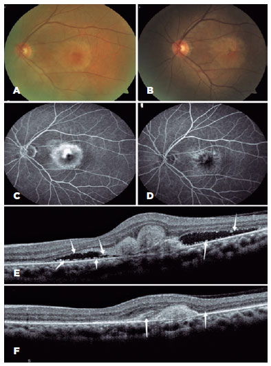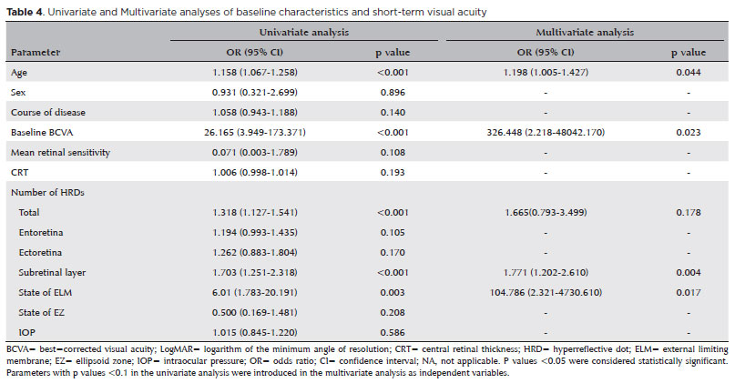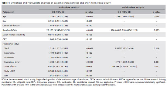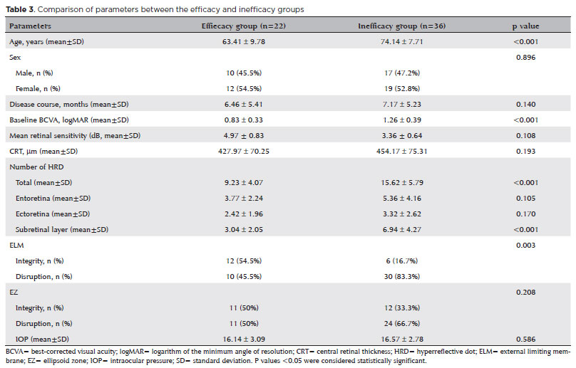 Resultados: Após 6 meses de tratamento, a média da acuidade visual melhor corrigida melhorou de 1,10 ± 0,42 para 0,41 ± 0,18 logMAR; as sensibilidades retinianas médias aumentaram de 5,13 ± 0,86 para 7,32 ± 1,21 dB; a espessura retiniana central média diminuiu de 440,38 ± 61,05 para 260,01 ± 24,86 µm; e os pontos hiper-reflexivos, tanto em números totais quanto em cada camada de retina, foram significativamente reduzidos em comparação com os valores de antes do tratamento (todos com p<0,05). Houve 22 pacientes com visão melhorada e 36 pacientes com visão não melhorada. As análises multivariadas mostraram que o número de pontos hiper-reflexivos sub-retinianos, o estado da membrana limitante externa, a melhor acuidade visual corrigida inicial e a idade foram preditores independentes para a melhor acuidade visual corrigida (todos com p<0,05).