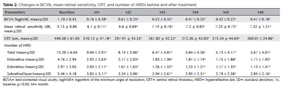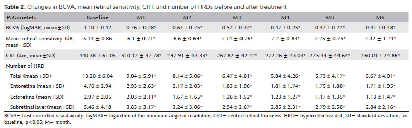 After 6-month treatment, the mean BCVA improved from 1.10 ± 0.42 logMAR to 0.41 ± 0.18 logMAR, the mean retinal sensitivity increased from 5.13 ± 0.86 dB to 7.32 ± 1.21 dB, the mean CRT measurements decreased from 440.38 ± 61.05 µm to 260.01 ± 24.86 µm (all p<0.05; Table 2). From baseline to month 6, the total number of HRDs decreased from 13.20 ± 6.04 to 5.67 ± 4.01. The numbers of HRDs in the entoretina, ectoretina, and subretinal layer decreased from 4.76 ± 2.94 to 1.71 ± 1.95, from 2.97 ± 2.05 to 1.13 ± 1.47, and from 5.46 ± 4.18 to 2.84 ± 2.16 (all p<0.05; Table 2).