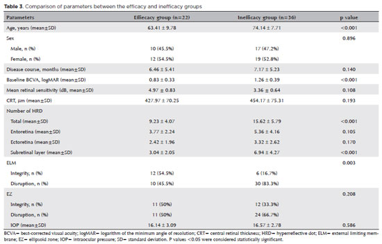 We observed that the state of ELM at baseline was also an independent predictor of BCVA at 6 months after treatment in the multivariate analysis. The ELM, a marker of photoreceptor function, was considered the zonula adherens between Müller cells and photoreceptors, and the potential for visual function and recovery may be directly assessed on the basis of its status(21,22). Disruptive ELM could not stop extravasated lipoproteins from migrating and depositing in the outer layer of the retina, which may damage the photoreceptor status and Müller cells, causing poor vision(23,24). Landa found that the integrity of the ELM layer appeared to be a critical factor for the restoration of the photoreceptor layer and for predicting a successful visual outcome(25). At baseline, 12 patients (54.5%) in the efficacy group and 6 patients (16.7%) in the inefficacy group had an intact ELM, with statistically significant differences, suggesting that the final visual acuity prognosis of the patients with an intact ELM was relatively good. Similarly, some studies suggested that the intact initial ELM predicts a better visual outcome(26).