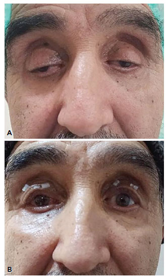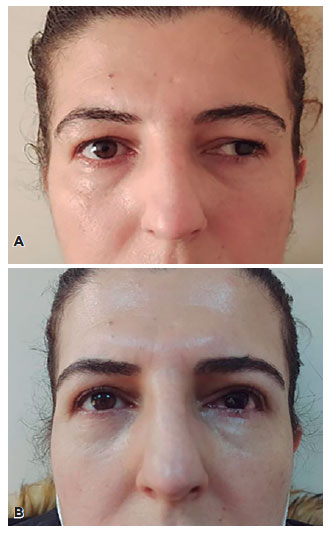 Blepharoptosis sometimes coexists with strabismus in adults(1). Strabismus and eyelid disorders can develop secondary to systemic diseases (such as Graves’ disease) or can be present since childhood. Patients with both of these conditions typically have limitations in their field of vision, with cosmetic appearance and psychosocial effects(2-6). Surgical treatment is commonly required to correct both ptosis and strabismus. Although sequential surgery is conventional(7), simultaneous surgery has recently been described as efficacious in the aesthetic rehabilitation of thyroid-associated orbitopathy(8). McCracken et al.(9) reported successful results with simultaneous eyelid retraction and strabismus surgery in adults both with and without thyroid-associated orbitopathy. Additionally, successful simultaneous correction of both congenital ptosis and strabismus has been reported in children(10,11). However, no studies on simultaneous correction of ptosis and strabismus have been reported in adults without thyroid-associated orbitopathy.