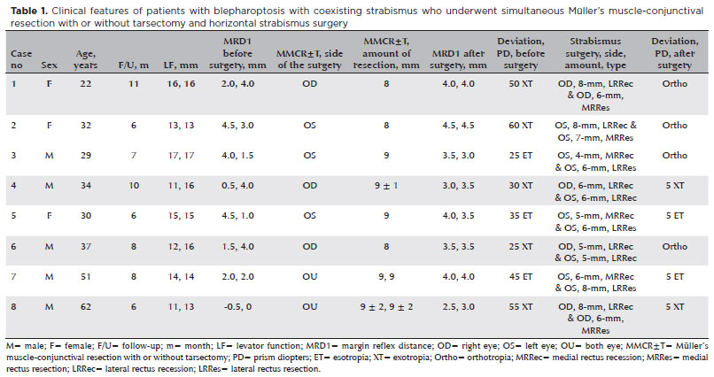 Conclusões: A ressecção musculoconjuntival de Müller, com ou sem tarsectomia, pode ser combinada com a cirurgia de estrabismo em uma abordagem alternativa para pacientes com ptose e estrabismo coexistentes.