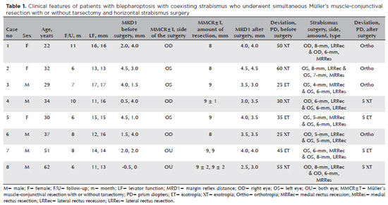 Resultados: Os pacientes foram 3 mulheres e 5 homens, com média de idade de 37,12 anos (faixa de 22 a 62 anos). A parte de estrabismo da cirurgia foi realizada primeiro em todos os pacientes. Os resultados da simetria palpebral superior foram avaliados como perfeitos (<0,5 mm) em 4 pacientes, bons (≥0,5 mm, <1 mm) em 4 pacientes e regulares (≥1 mm) em nenhum. A ressecção musculoconjuntival de Müller, com ou sem sucesso na tarsectomia, teve sucesso em 6 dos 8 pacientes (75%) e a intervenção para o estrabismo foi bem-sucedida em todos os pacientes. Não foi necessária cirurgia de revisão da pálpebra ou do estrabismo após a cirurgia simultânea em nenhum paciente.