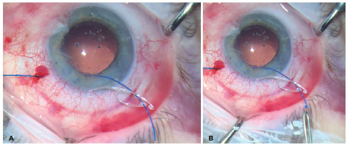 When the needle is in the anterior chamber, we use 23-gauge micro-forceps through the corneal incision to place a 5-0 polypropylene monofilament into the 26-gauge inner cavity of the needle (Figures 1A and 2A). Next, the needle externally guides the suture end within the sclera (Figures 1B and 2B), and we pass an adjustable 5.0 polypropylene suture through the anterior chamber: one end out of the corneal incision and the other end out of the sclera.